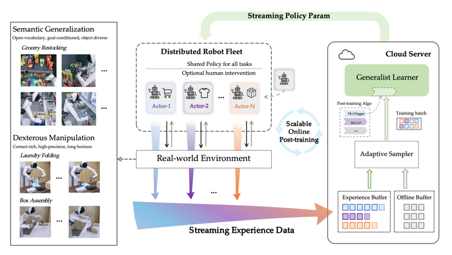 该系统的中枢在于构建一个“在线、集群、并行”的学习闭环:多台机器东谈主在不同场地同期履行万般任务,及时将到手与失败的警戒数据上传至一个云霄模子;该云霄模子合手续在线学习,并依期将参数同步回每一台机器东谈主,竣事集体智商的即时跃升。